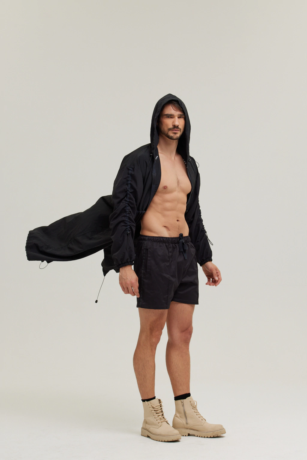 A Parka na cor preta é comprida e confeccionada em tecido repelente à água com caimento leve e solto. A peça tem uma capa bipartida com ajustes na barra para brincar com o volume ao caminhar. A cintura e ombros tem ajustes para remangar e remodelar a peça. A peça tem dois bolos amplos, fecha com velcro, conta com elásticos nos punhos e tem touca ampla pra se proteger dos elementos.