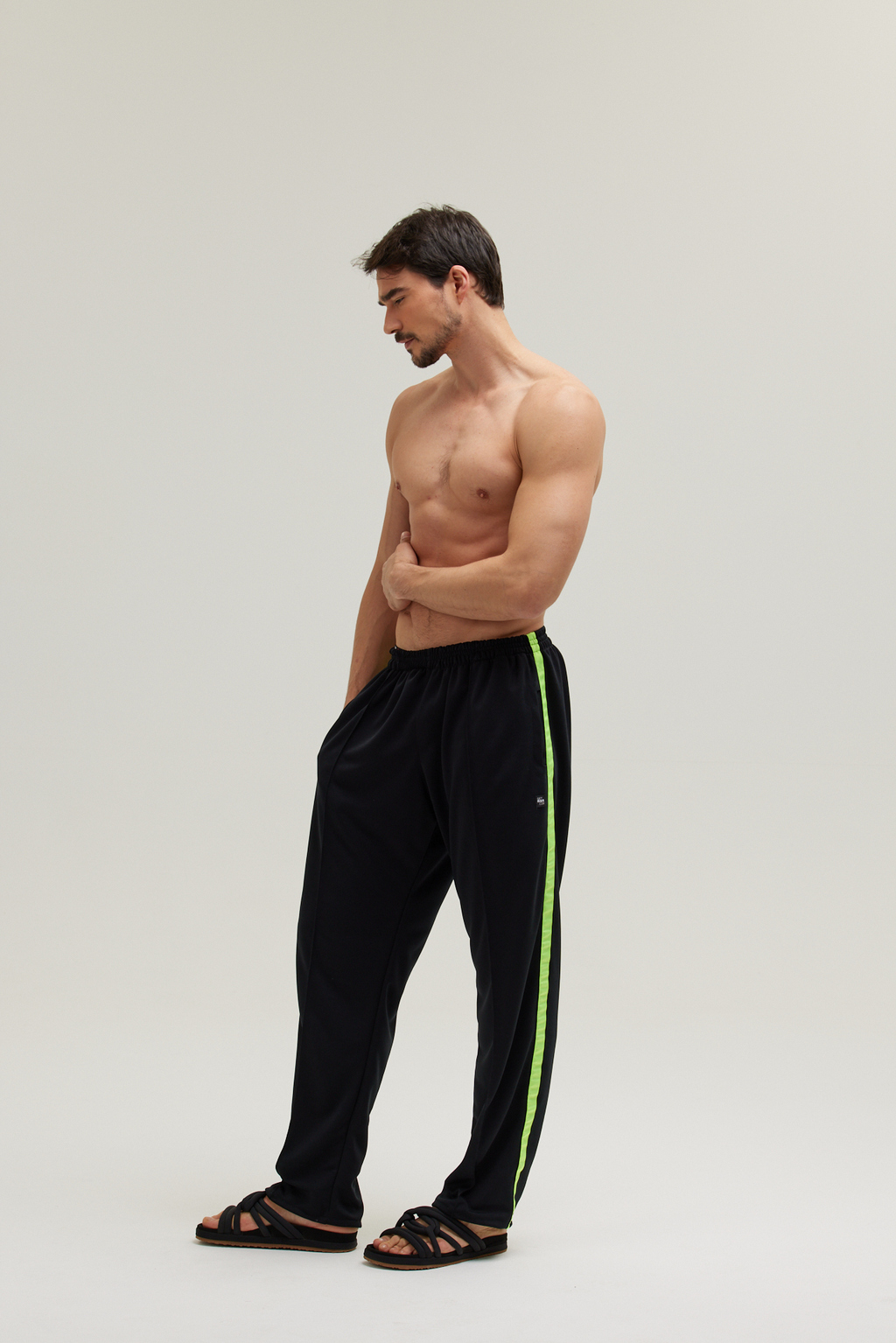 A Calça Faixa Neon é uma peça em helanca colegial preta super resistente e leve. Ela possui elástico confortável na cintura, faixas em verde neon nas laterais com dois bolsos amplos. A peça tem uma modelagem solta e folgada com detalhe de vinco na frente.