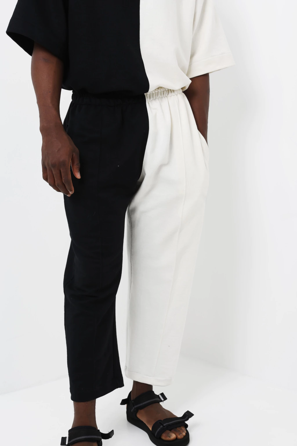 A Calça Bicolor P&B é uma peça super confortável em moletom preto e branco off-white careca de textura super macia, leve e fofa. A peça tem modelagem folgada, com elástico largo na cintura e dois bolsos amplos laterais com forros em piquet ecológico com poliéster proveniente de garrafas PET.