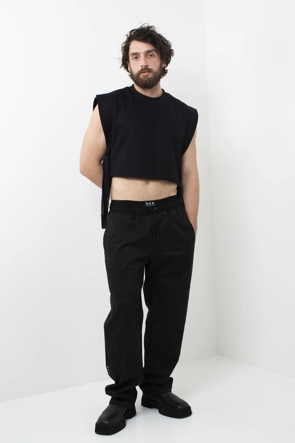 Cropped de modelagem muscle em moletom careca preto com ilhós laterais para fechamento em amarração.