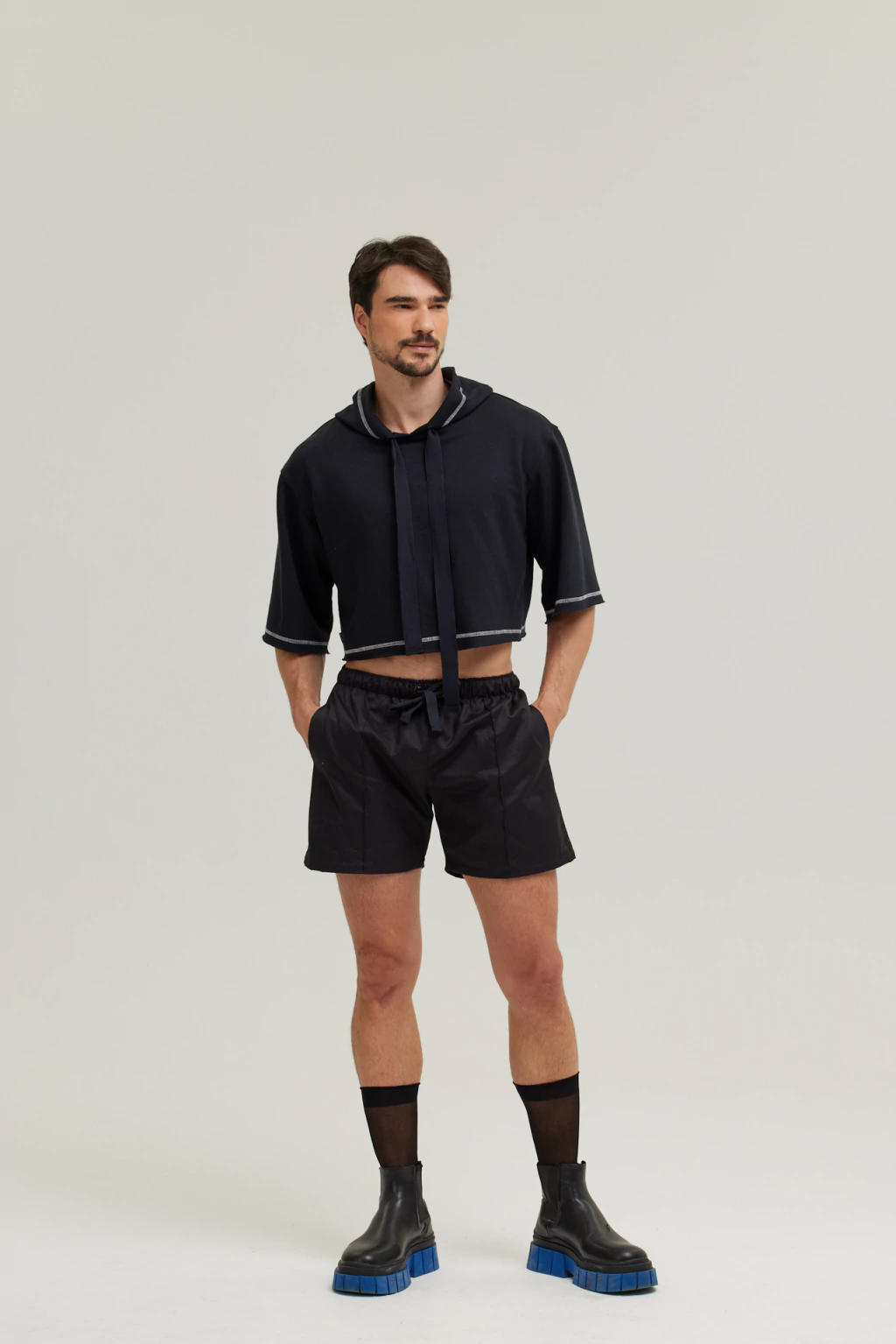 De vez en cuando, nos encontramos con la monotonía de la misma silueta. Miramos a nuestro alrededor y parece que todas las siluetas son iguales, y cuando son diferentes, casi se espera. ¡De esta monotonía nació nuestra sudadera corta negra con capucha!