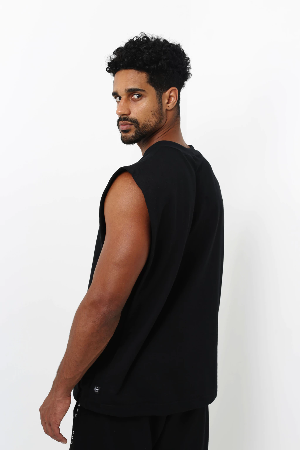 A Regata Muscle Prta é uma regata de modelagem ampla no estilo muscle tee. A peça tem gola de ribana grossa e conta com recortes laterais nas cavas com vistas que dão um efeito 3D e alarga os ombros. Ela é confeccionada em moletom careca preto.