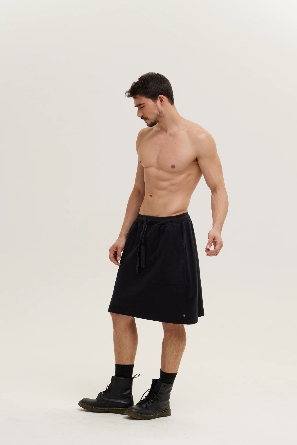 Saia de moletom estilo kilt com bolsos bolsos amplos, cintura com elástico e cordão.