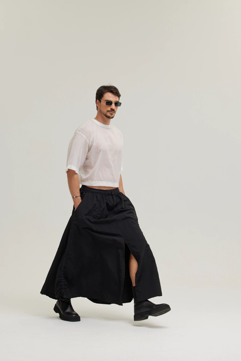 Dejamos de lado lo obvio para ahondar en la dualidad de las prendas que se moldean, se adaptan y pueden ser ambas cosas. La Falda Pantalón Ajustable se encuentra en ese punto intermedio entre falda y pantalón, ya sea corto o largo.