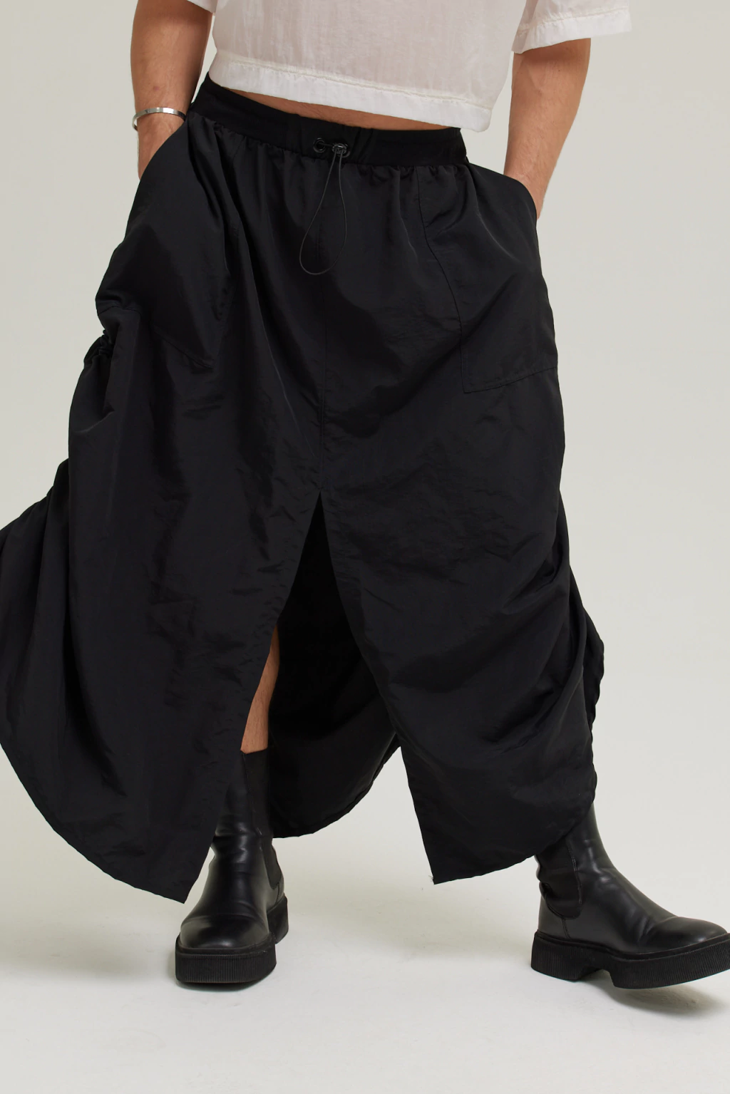 La prenda cuenta con una cinturilla elástica con ribete, ajustes laterales para ajustarla, tirar y jugar con el ajuste, además de amplias aberturas delanteras y traseras que la hacen parecer pantalón o falda.